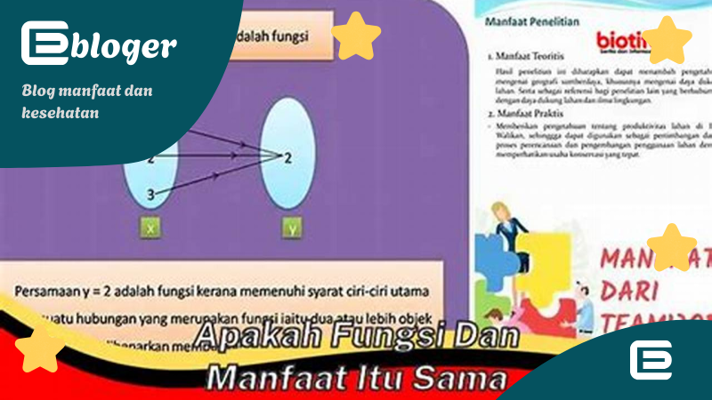 Apakah manfaat dan fungsi itu sama? Manfaat adalah keuntungan atau kebaikan yang didapat dari sesuatu, sedangkan fungsi adalah peran atau tugas yang dijalankan oleh sesuatu. Jadi, dapat disimpulkan bahwa manfaat dan fungsi itu tidak selalu sama. Misalnya, sebuah obat memiliki fungsi untuk menyembuhkan penyakit, sedangkan manfaatnya adalah kesembuhan dari penyakit tersebut.